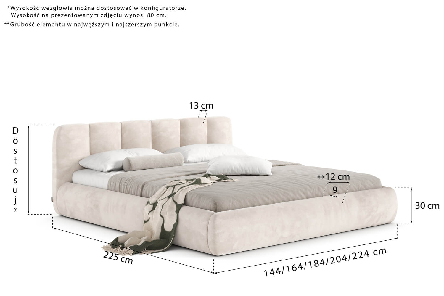 Wyświetlane wymiary możesz zmienić wybierając inną powierzchnię spania w konfiguratorze