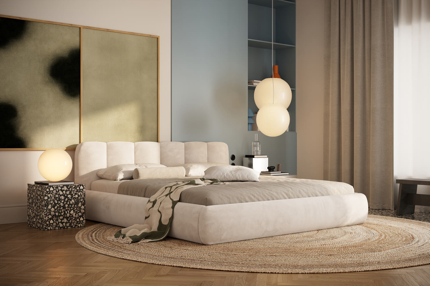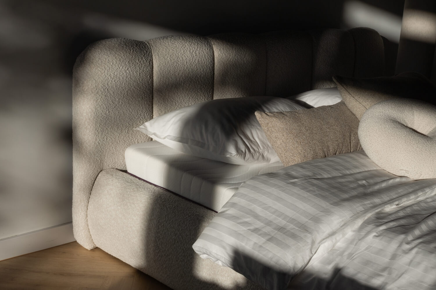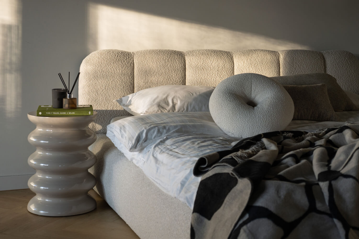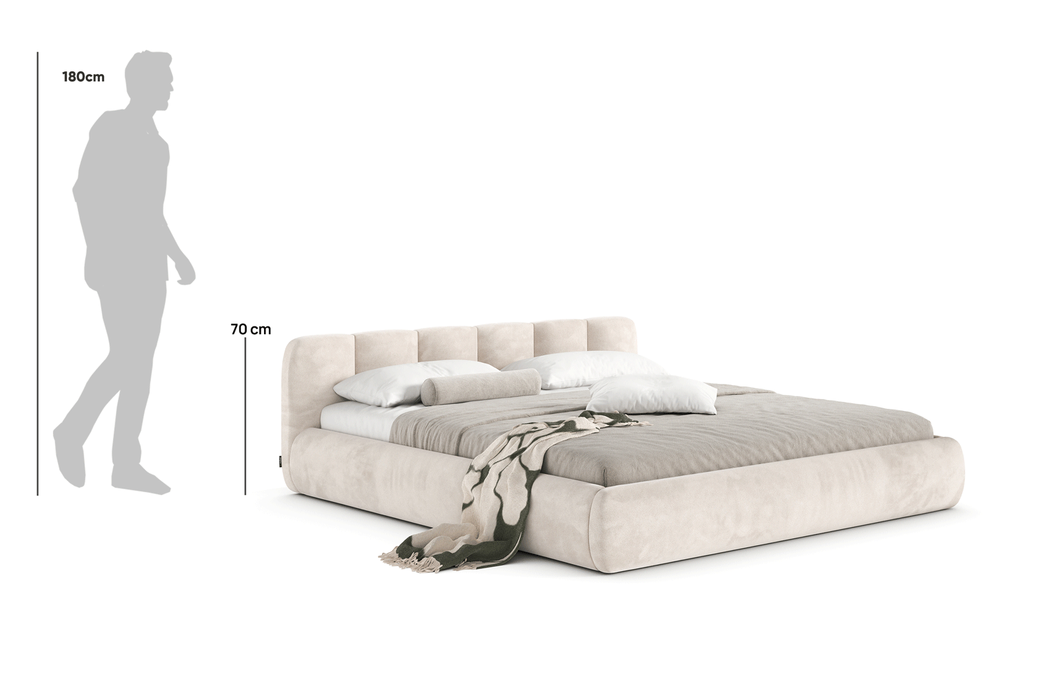 Felicia od MyBed to łóżko, które już od pierwszego spojrzenia obiecuje wyjątkową wygodę i miękkość. Jego tapicerowany, delikatnie zaokrąglony, panelowy zagłówek (z kilku pionowych segmentów) przypomina duże, puszyste poduchy i tworzy przytulne oparcie idealne do wieczornego relaksu. Jasnobeżowa, welurowa tapicerka oraz niska, masywna rama z łagodnie zaokrąglonymi bokami sprawiają, że model ten świetnie odnajdzie się zarówno w nowoczesnych, jak i bardziej klasycznych aranżacjach. Lekka i harmonijna forma łóżka Felicia wnosi do sypialni atmosferę spokoju, ciepła i stylowego komfortu – to idealny wybór dla tych, którzy cenią estetykę połączoną z wygodą codziennego wypoczynku.