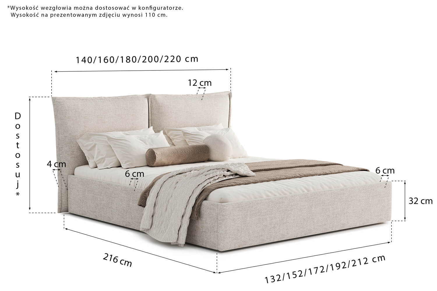 Wyświetlane wymiary możesz zmienić wybierając inną powierzchnię spania w konfiguratorze