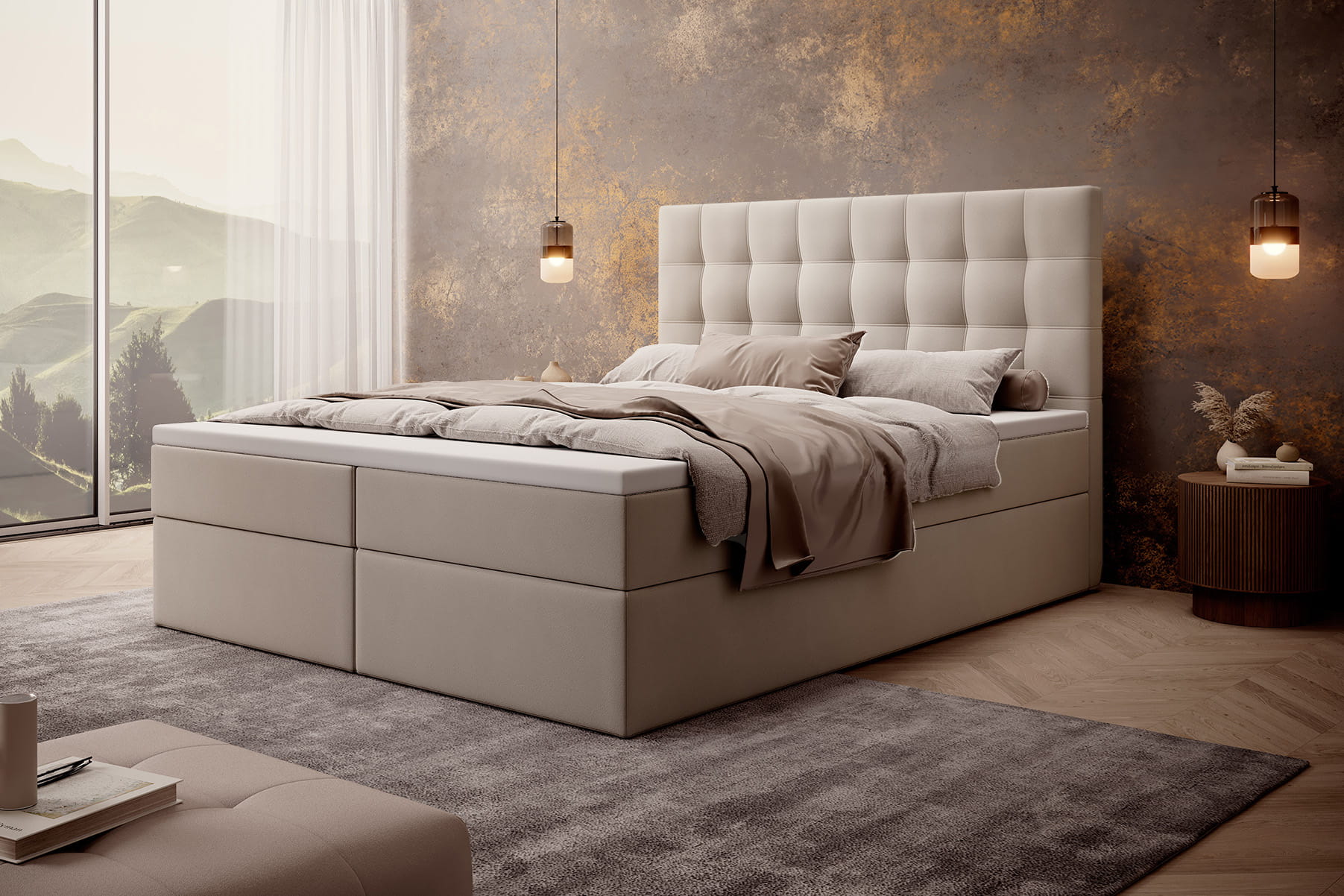 Łóżko kontynentalne Cube od MyBed od pierwszego spojrzenia zachwyca swoim oryginalnym designem i wyjątkowym wykończeniem. Masywne wezgłowie, ozdobione wyrazistymi, geometrycznymi przeszyciami, wprowadza do sypialni przyjemny, nowoczesny akcent, który nadaje wnętrzu charakteru i dynamiki. Wysoka i solidna konstrukcja nie tylko imponuje wyglądem, ale także gwarantuje doskonały komfort użytkowania, tworząc idealną przestrzeń do relaksu. Cube to idealne połączenie wyrafinowanego stylu i wygody, które podkreśla bardzo luksusowy wymiar każdej sypialni.
