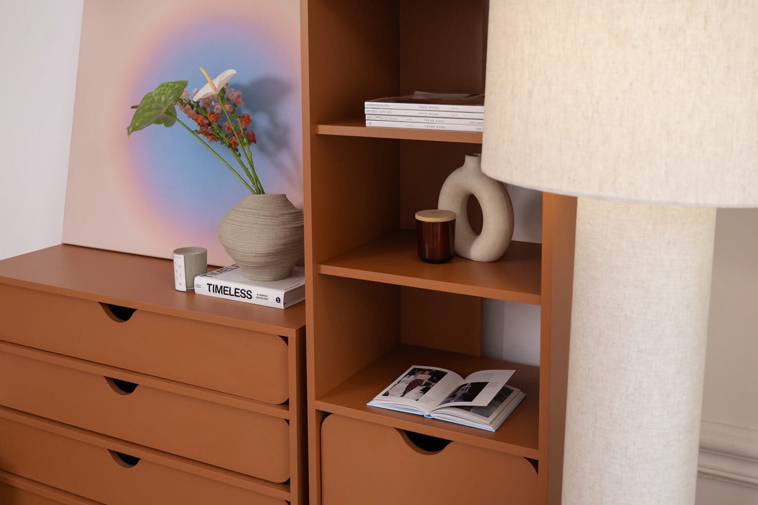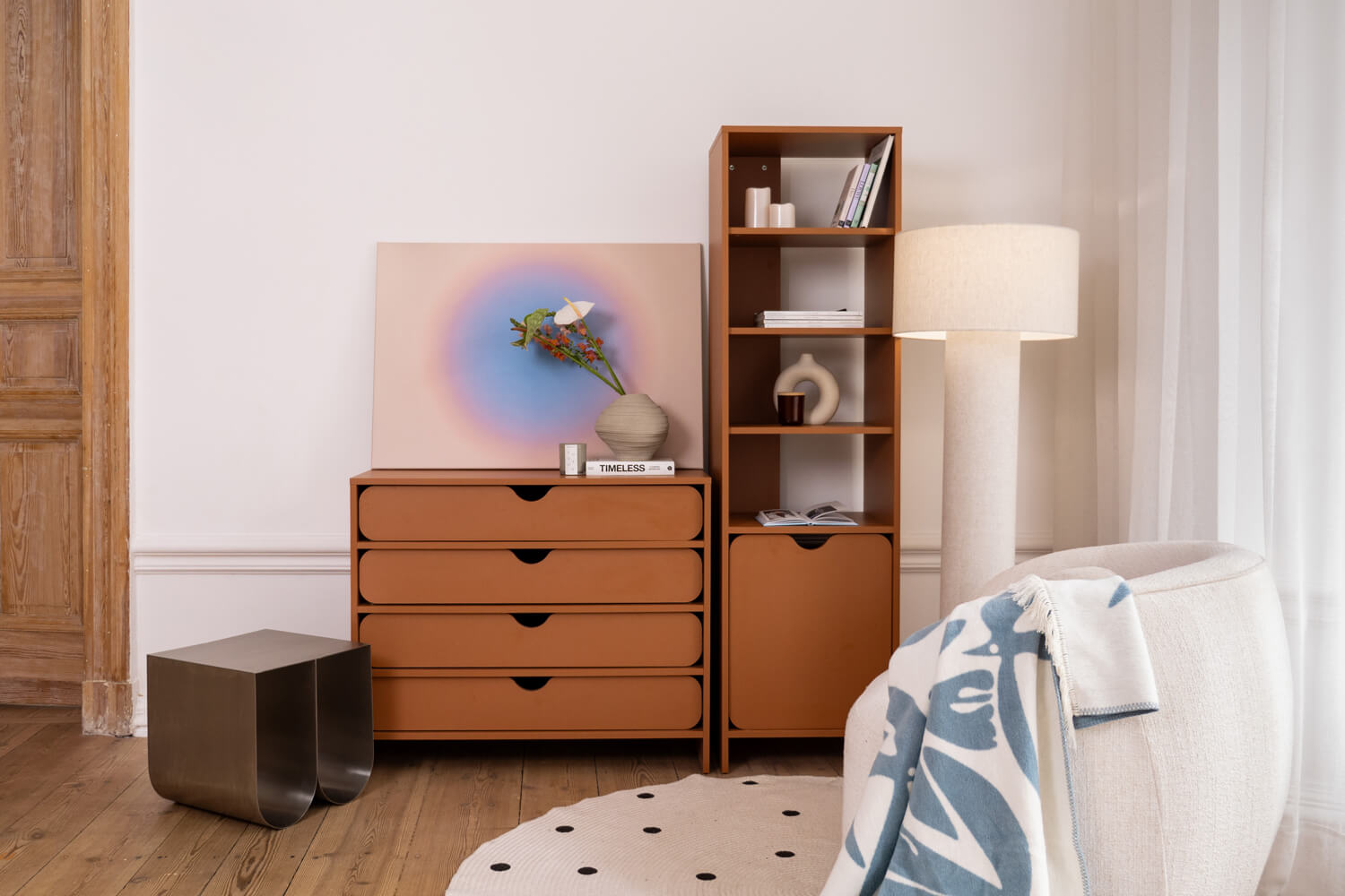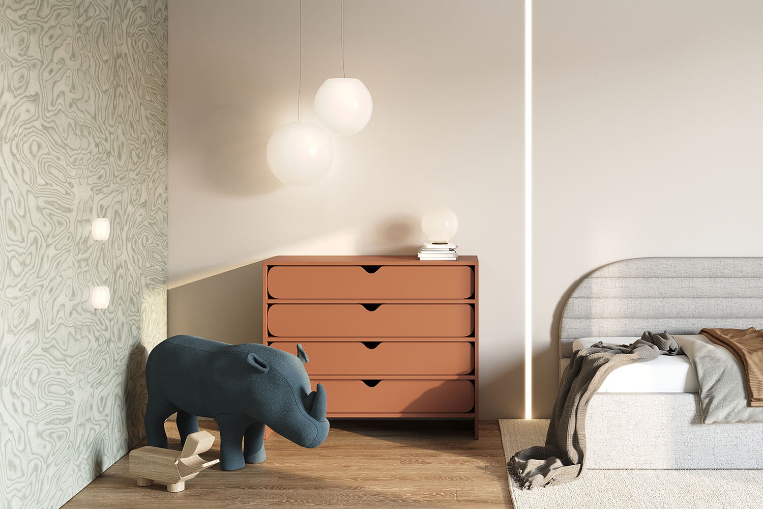 To element, który nadaje wnętrzu nowy wymiar. Jej geometryczna forma i ciepły, ceglany kolor przyciągają wzrok, a jednocześnie wprowadzają do przestrzeni spokój i harmonię. Ustawiona w sypialni, salonie czy przedpokoju, staje się funkcjonalnym centrum aranżacji i miejscem, gdzie estetyka spotyka się z praktycznością.